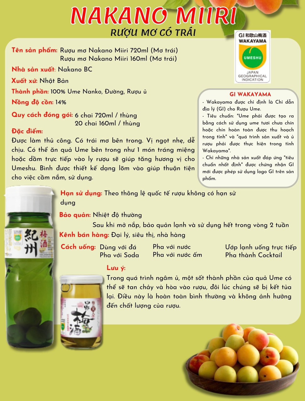 Umeshu Nakano Miiri, loại rượu mơ Nhật này, được sản xuất tại vùng đất Wakayama – tỉnh có sản lượng quả mơ Ume lớn nhất Nhật Bản. Mỗi năm, Wakayama sản xuất khoảng 60.000 tấn quả Ume, chiếm 60% sản lượng quốc gia. Quả Ume được thu hoạch và rửa sạch bằng nước ngay sau đó. Ngâm quả Ume trong ngày giúp chúng chín nhanh và giữ được độ tươi ngon. Đây chính là một trong những yếu tố quan trọng tạo nên vị ngon đặc trưng của Umeshu.
