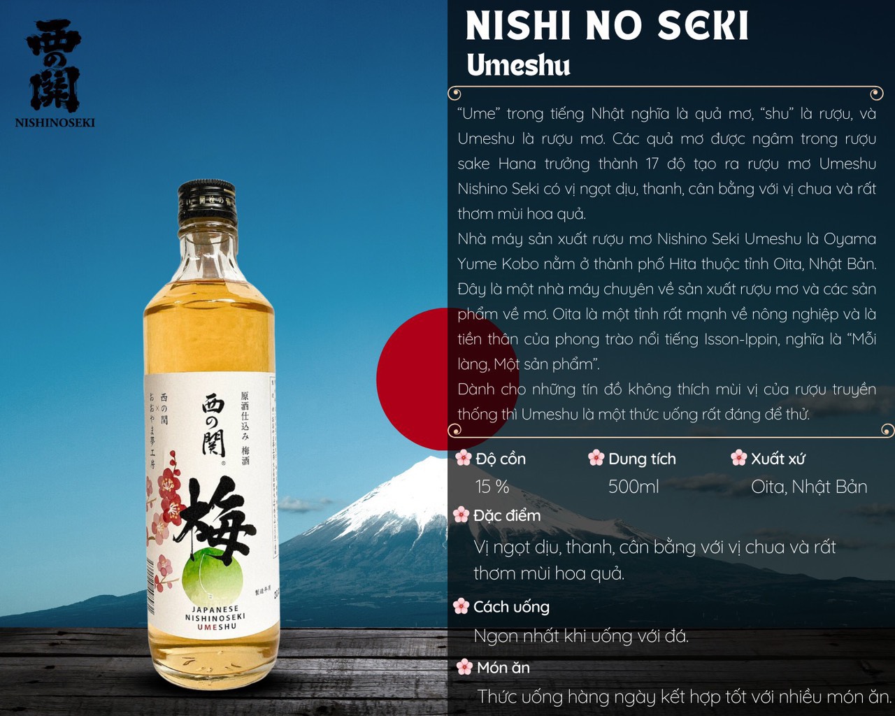 Rượu mơ Nishino Seki Umeshu (15%) 500ml mang đến một hương vị độc đáo và thú vị. Với việc ngâm quả mơ trong rượu Sake Hana 17 độ, rượu mơ Nishino Seki Umeshu có vị ngọt dịu, thanh và cân bằng với vị chua. Mùi hoa quả thơm ngát là đặc trưng của rượu mơ này.